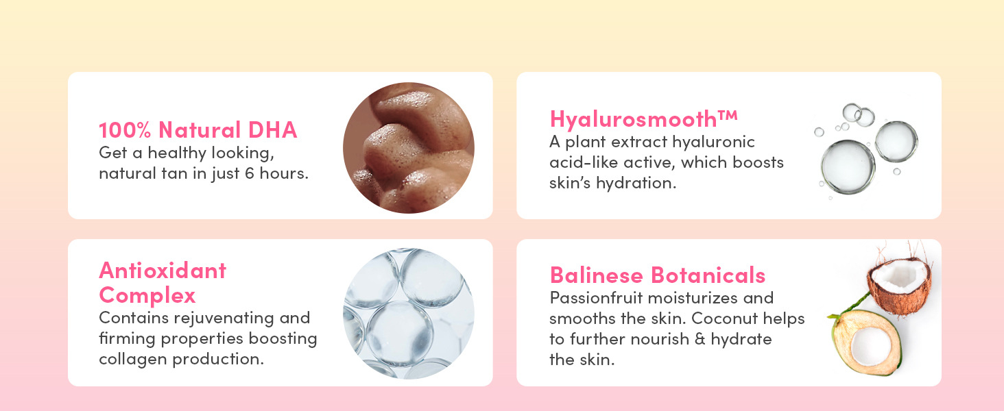 OFFERS AN UNBELIEVABLE SCENSORY EXPERIENCE. We’re all about getting results, but we also sweat the small stuff when formulating our products – like scent. When it comes to self-tan, we know the usual biscuity smell is a major concern. But don’t worry, you can leave your worries behind because our tanning mist smells like a tropical paradise in a bottle.