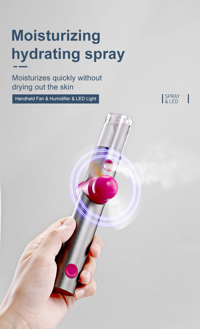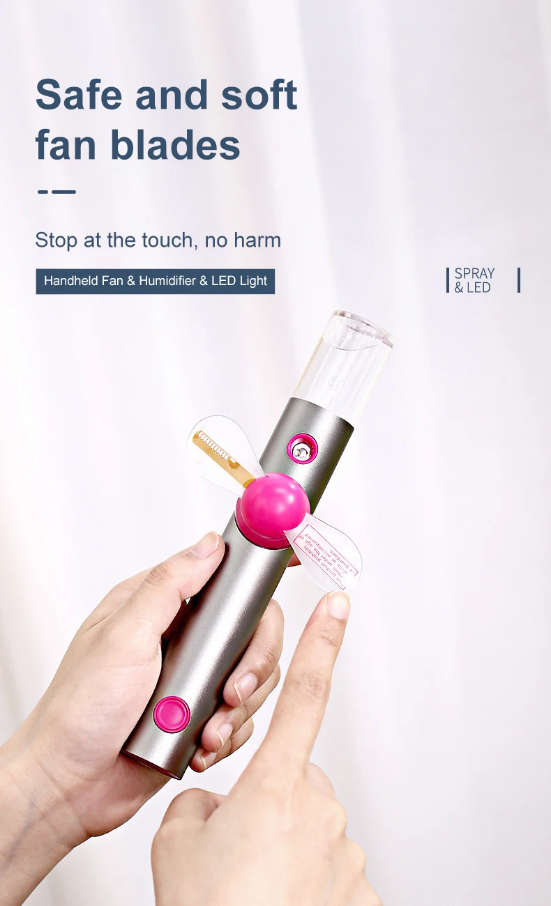 【New Misting Design】 Long press to turn on the fan, press once to turn on the spray, enjoy a different cooling experience.【Rechargeable Battery】Adapt large capacity 1500mAh rechargeable battery. PC, laptop or any USB outlet compatible.【Handheld or Standing】 Hand-held or as a desk fan design is suitable for most scenarios. The metal body design is very stylish. Great for indoor, outdoor, and traveling.【Easy to Carry】 Mini fan is light, compact and portable, wouldn't take up space in your bag.【Notice】 Water can be added to the spray bottle, but liquids such as perfumes and fragrances cannot be added.
