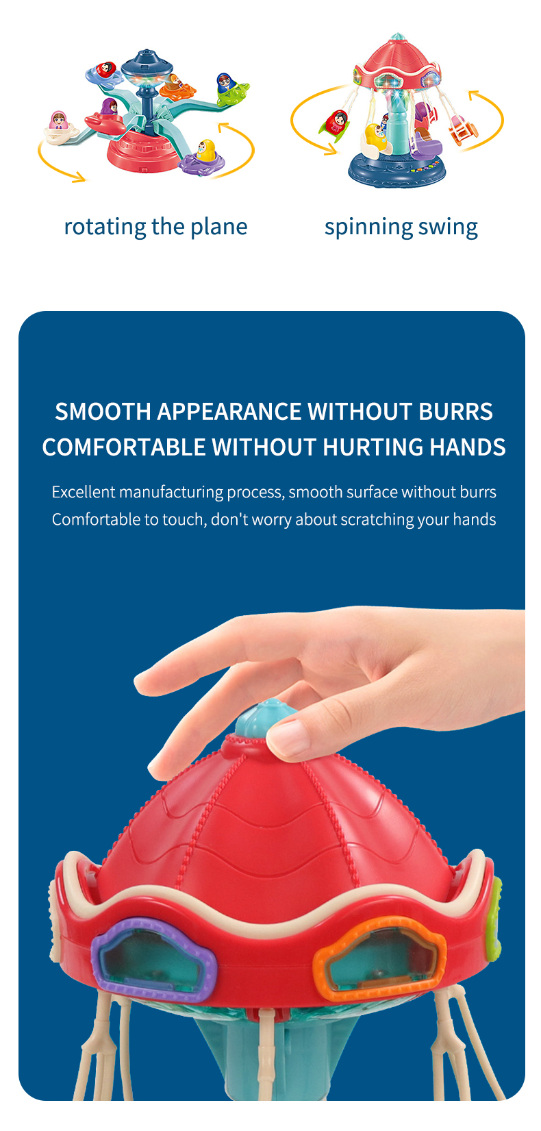 1.The rotating swing design of the simulation amusement park satisfies the children's dream of paradise.2.Contains educational content such as nursery rhymes and stories, so children can play while learning.3.Motorized 360°rotation, the rotation is accompanied by colorful lights and music.4.Select high-quality plastic materials.5.The rules of the game are easy to understand, and children and the elderly can play.6.Children can play with their parents and friends.