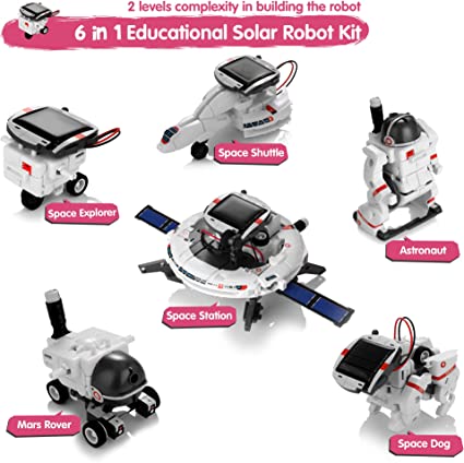 【6 Different Types of Solar Robots】Build 6 different types of robot with the included moving and connecting parts like plates, wheels and shafts. Kids can easily build a wide assortment of models from Mars rover > space explorer > space shuttle > space dog..., fulfilling their infinite imagination about space travel and bringing the feeling of exploration with our solar robot toys.【Operated by Solar/Battery】Powered by the sun or battery(included), the robot moves in direct sunlight with the solar energy collected by the included solar panel. You can also use batteries to drive motor to help start the robot indoors.【STEM Education Toy】Proven to be the most effective way to nurture young minds, and boost kids'confidence, patience and critical thinking skills. These science solar robot kits allow children to explore and learn fundamentals of science through play. Meanwhile, it promotes kids to develop hand-eye collaboration and teamwork spirit.【Easy to Build for Kids】Instruction for Use enclosed in the package. It's simple for child to build their own robot with parts and accessories. The parts can be easily dissembled after completion of one robot. Robots with a varying degree of difficulty, and your kids can either try and assemble a robot model by themselves or do it together with friends and share hours of fun playtime!【Ideal Gift】All pieces are sturdy and durable, which are made of premium quality harmless and non-toxic ABS plastic. Ideal gift for kids'birthday/Children's Day/Christmas/Easter/school activity for age 8+ boys and girls.