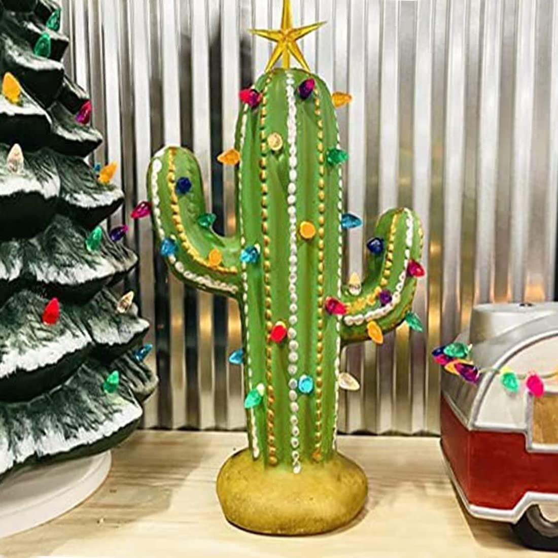 【LIGHTED CERAMIC CHRISTMAS CACTUS】A modern reboot of the classic vintage tradition. Perfect for Holiday home decor or year round joy.【LIGHT UP THE NIGHT】 Small size(13cm*17cm*8cm), light weight, gorgeous lighting effects, creating a festive atmosphere for you, use this ceramic tree as a colorful and interesting holiday decoration. It will beautify your space and bring festive joy.【WONDERFUL CHRISTMAS ATMOSPHERE】Enjoy this beautiful Christmas Cactus and Christmas holidays.The tabletop Christmas Cactus is pre-installed with lights to bring brilliant shine and bright up your home.【HIGH-QUALITY RESIN MATERIALS】Made of stable Resin materials, the tabletop tree is hard-wearing and heat-resistant to prolong its service life.while the smooth surface facilitates daily cleaning.【EYE-CATCHING ADDITION FOR ANY PLACE】 The Christmas cactus that will impress your cactus loving friends.is small enough to fit any narrow places well,You can put it at home and enjoy Christmas with your family pleasantly.【3 Button Batteries Included】